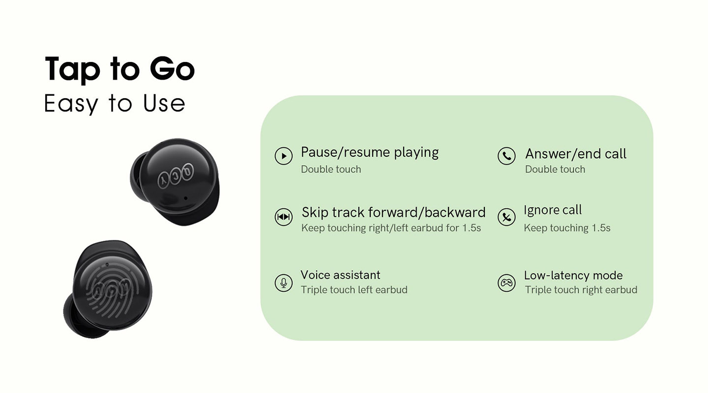 Зручне сенсорне керування дозволяє керувати роботою QCY T17 за допомогою простих торкань. Дотиком до навушника можна вибрати трек, поставити музику на паузу, відповісти на вхідний дзвінок, активувати голосового помічника або вибрати режим низької затримки для перегляду відео.