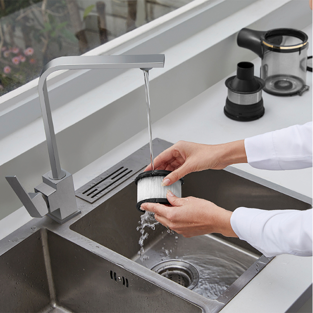 Акумуляторний пилосос легко утримувати в чистоті. Просто промийте циклонний фільтр, пилозбірник і роликову щітку під проточною водою та дайте їм висохнути. А потім повісьте пилосос на стіну — для цього він має надійний тримач.