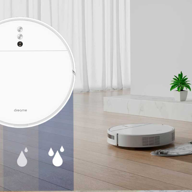 Під корпусом розташований компактний бак на 200 мл. Прямо під ним — мікрофібра. У режимі вологого прибирання вода подається на очисну серветку, яка протирає підлогу, усуваючи забруднення. У застосунку можна налаштувати рівень подавання води залежно від складності плям. Завдяки розумному дозатору після проїзду робота на підлозі не залишається калюж і розводів.