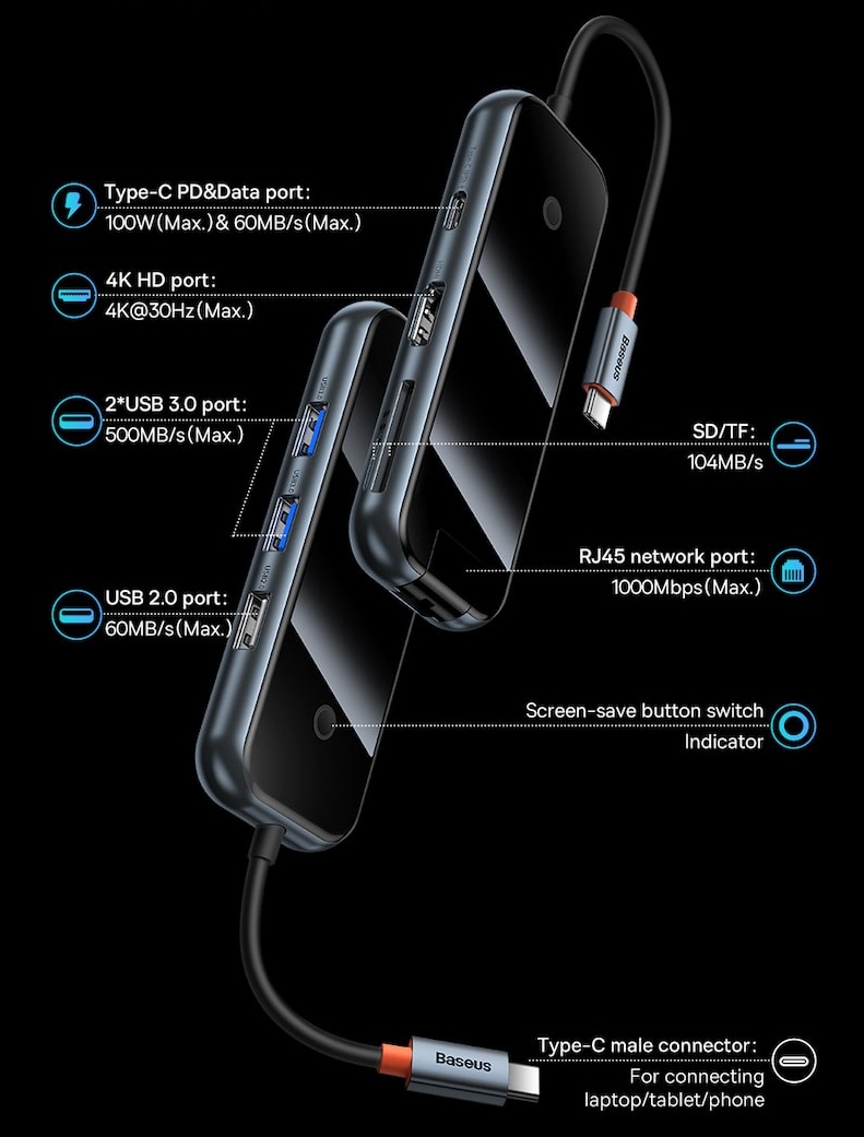 Цей компактний і зручний адаптер від Baseus — AcmeJoy 8-Port Type-C Hub Adapter — є ідеальним рішенням для всіх, хто шукає спосіб розширити можливості свого USB Type-C порту. Завдяки цьому пристрою, ви зможете легко додати до свого пристрою неймовірну кількість 8 різних портів різних типів, від USB до HDMI.