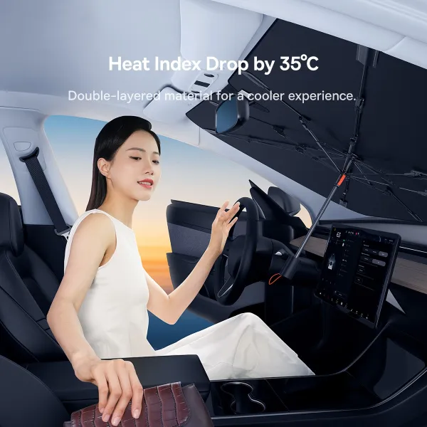 Завдяки титаново-срібному полімерному покриттю сонцезахисна парасолька для захисту від сонця та перегріву салону автомобіля Baseus CoolRide Doubled-Layered Windshield Sun Shade Umbrella Pro Large відводить до 35.