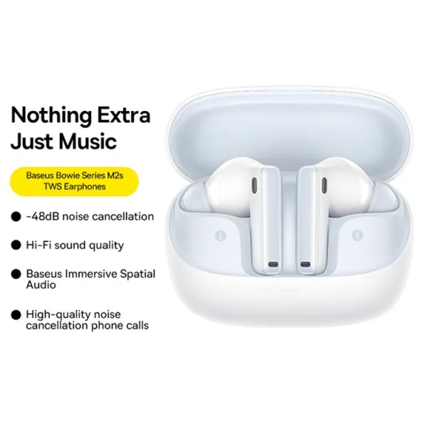 Обидва навушники Baseus Bowie M2s TWS обладнані акумулятором ємністю 35 мА·год, якого вистачає на 7 годин роботи. З зарядним кейсом, обладнаним акумулятором ємністю 400 мА·год, загальний час роботи навушників може бути збільшений до 30 годин, щоб ви могли грати, коли захочете. Чохол можна заряджати за допомогою кабелю USB-C. 10 хвилин заряджання досить для 2 годин прослуховування музики!